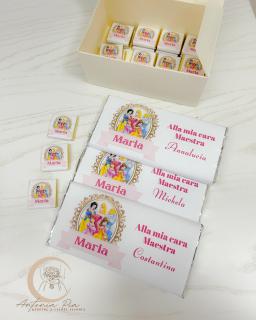 In aggiunta alla sua torta di merendine e succhi, le tavolette di cioccolato per le Maestre + box cioccolatini, per festeggiare i 4 anni di