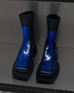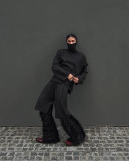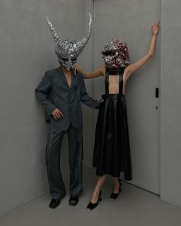 Exaggerated shoulders seemed to be inspired by dark nymphs, whereas a chrome hand-like bra's futuristic shape stood out amongst the natural setting. Models wore angular statement-making eyewear, while skin was kept bare and dewy, keeping the focus on the expertly crafted garments. Voluminous sky-high collars transformed models into swan-like creatures. Meanwhile, textural full head masks r
