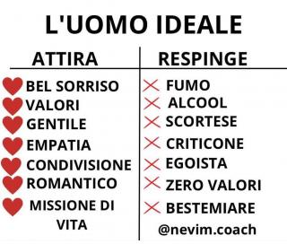 Puoi prendere un foglio e iniziare a scrivere le cose che ti attirano di un uomo o una donna, dall’altra parte le cose che ti respingono, mi raccomando come vedi Nevim nella sua lista ho messo non criticone quindi, se incontra un bel uomo che critica tutti âŒnon cambia idea, non inizia una relazione chiudendo i suoi occhi a questo!âŒ