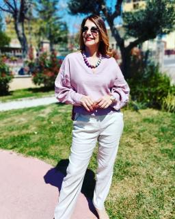 The high-waisted trousers I'm wearing are a classic that never goes out of style. The V-neck blouse with a wide silhouette and voluminous sleeves is the ideal combination for a comfortable yet elegant look.
