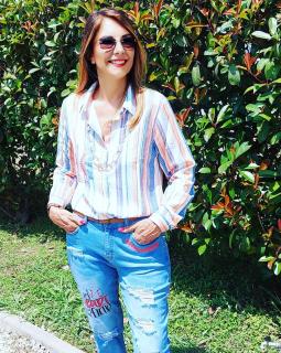 This colourful striped shirt goes well with jeans, shorts and skirts. It is made of cotton, very cool and has a beautiful fit.