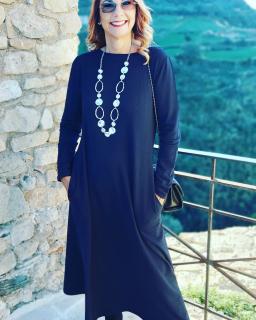 Today I'm wearing a blue crew-neck dress with ¾ sleeves that is really very comfortable.